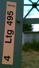 DE: Drei Leiterseile bilden ein System, welches mit einer (dreistelligen) Nummer am Mastfuß vertreten ist. Die Mastbeschriftung zeigt immer (nicht ausschließlich!) in absteigende Richtung und ist schwarze Schrift auf gelben Hintergrund. Ältere Schilder haben einen weißen Hintergrund. Es hängen meißt zwei Systeme an einem Mast, weshalb es zwei Beschriftungen (links und rechts) pro Mast gibt. Ein System behält seine Identität (Nummer) vom Start-UW bis zum Ende. Die Mastnummer ist auf beiden gleich und die Leitungsnummer unterschiedlich. Der Text lautet "aaa Ltg bbb", wobei die obere Zahl die Leitungsnummer und die untere die Mastnummer darstellt. Sollten die Schilder falsch (auf dem Kopf stehend) angebracht sein, so erkennt man die MAstnummer trotzdem daran, dass sie auf beiden beschriftungen gleich ist. Es gibt keine führenden Nullen bei der Mastnummer. Die Mastnummern der Abzweige lauten z.B. "20M", wobei M der Anfangsbuchstabe des Ziel-UW's ist.