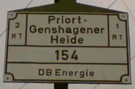 DE: Stromleitungen sind benannt nach dem Schema Start Unterwerk - End Unterwerk (von - nach). Das Schild auf dem die Nummer und der Leitungsname stehen zeigt in Richtung absteigende Nummern. Eine Leitung besteht üblicherweise aus zwei Stromkreisen mit je zwei Leiterseilen, also vier Leiterseilen. Diese Leiterseile sind gewöhnlich single. Bündelleitungen aus zwei (double) oder vier (quad) Leitern je Leiterseil sind seltener. Auch die Kombination aus mehr als zwei Stromkreisen ist nicht so häufig, aber bis zu 6 Kreise (12 Leitungen) treten durchaus auf. Die Spannung beträgt 110 kV symmetrisch, also 2 x 55 kV pro Stromkeis, die Frequenz 16,7 Hz. Aus Konkurrenzgründen gibt es Hybridleitungen mit dem öffentliche Stromnetz nur, wenn keine eigenen Trassen zur Verfügung standen oder exorbitant teuer waren.