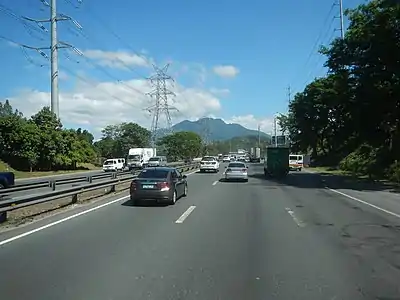 | 230 kV | 8 | Used on most transmission lines in Luzon, and as bulk transmission in Visayas and Mindanao. | Small to large double-circuit towers or poles, or single delta towers. Lines that run roadside or along railroads use steel poles. Height and size of structures may vary, ranging from the size of 69,000 volt-designed concrete or steel poles to the size of 500kV-designed lattice towers (15–46 meters (49–151 ft)). | ![]() ![]() ![]() ![]() ![]() | |