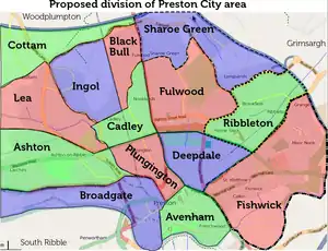 The various wards of Preston are perhaps not very convenient for mapping purposes. This table therefore uses arbitrary divisions as shown in the image above:
