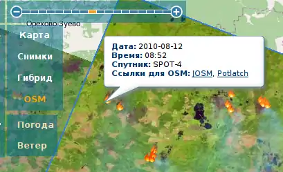 - Check that what you see is really a result of fire, and not something that has been there already for a long time. Enable the “Снимки” (“Imagery”) layer and disable “Снимки в реальном времени” (“Real-time imagery”) layer for some time. If you see woods or field at those usual images, and something brown at the real-time images, it's most likely the “burnt place” (term courtesy Komzpa).