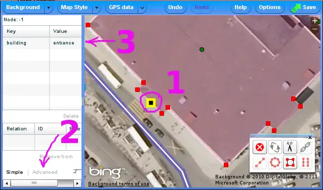Adding a building entrance node with Potlatch2 is illustrated below.