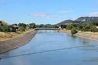 A big siphon allowing water to cross a valley. Only half side is visible on the picture, tunnels or pipelines are connecting each side at equivalent altitudes. The siphon is a pipe flow waterway. |