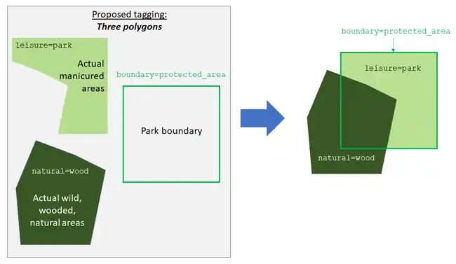 In the example below, two polygons are used to map a square park that is partially overlapped by a wild and natural wooded area. The square park is mapped by drawing a way around the park's boundary tagged leisure=park. The wooded area is mapped with an overlapping polygon that represents the wooded area tagged natural=wood. Thus, the lightest green area represents the manicured areas of the park, the medium green area represents the wild and natural wooded areas that are within the park boundaries, and the darkest green areas represent wooded areas outside of the park boundaries.