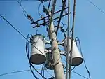 ![]() Three-level pole on branching point of roadside 69,000 volt line by National Grid Corporation of the Philippines, Laguna, Philippines |