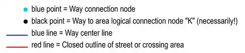 Points, located on the axis of the street called later in the text K (in the figure above points in red), are also points of areas area:highway=*, tagged as crossing:end=yes in cases if they have no other tag e.g. highway=stop.