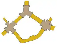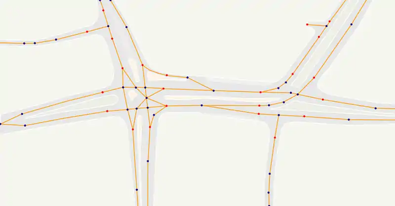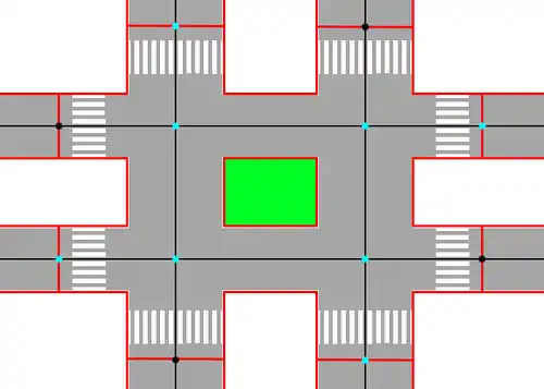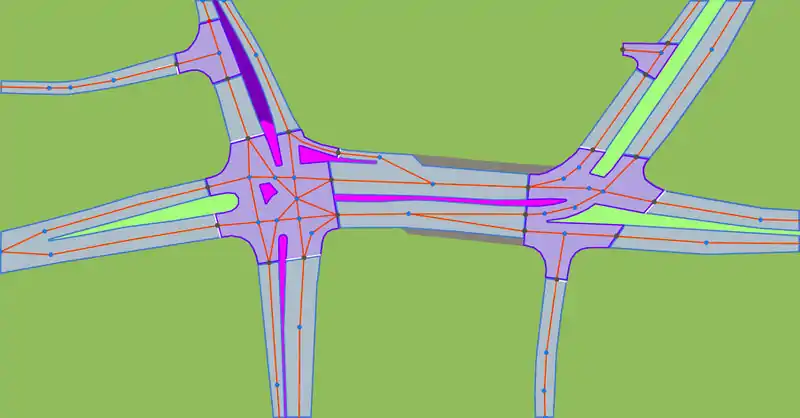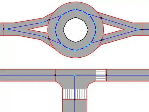 This example shows why it is neccesary to divide streets, especially Y-Junction in separate areas. "Crossing" areas are areas without rendering of lanes, because of two and more vectors in the same area.