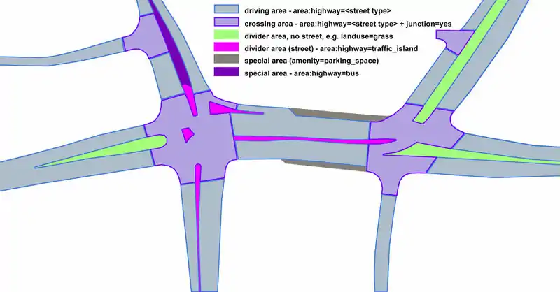 Junction areas: area:highway=<value of highway with highest priority> with junction=yes/roundabout/y_junction | ||