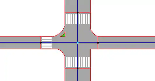 The orientation of "red line" on the left and right of node "K" may be different than 90°. The direction shows the real existing stop line direction of the street surface.