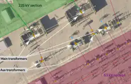 - Main transformers forward power between two or more different power grids (here between 63 000 volts <=> 225 000 volts sections and from 63 000 volts to distribution grid in blue), auxiliaries are branched on one particular voltage feeding another main unit.