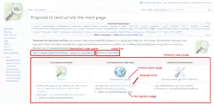 The main page contains a main navigation part, see also the image on the right. For every primary use case group there is a box. The first attention shall be attracted to the bigger link to an introductory page. The second attention comes to the list below, containing some most important related links (to be discovered by newbies and to be fast accessible for advanced users) followed by a link to the navigation page giving a more comprehensive overview. The secondary use case groups and a help link have much less space, but are still very present on the main page.