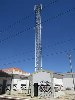 Torre da REFER, comum nas estações ferroviárias, com antenas para os sistemas Rádio Solo-Comboio (RSC) e GSM-Railway (GSM-R). |