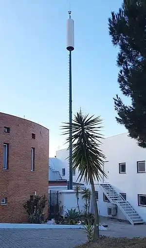 Torre com antenas cobertas por estrutura cilíndrica branca (por vezes verde), utilizadas principalmente pela Vodafone e MEO. |