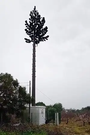 Estação base da MEO com torre e antenas dissimuladas de pinheiro |
