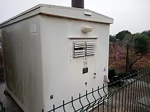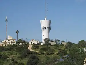Depósito de água com antenas de comunicações móveis instaladas na fachada. À esquerda torre de comunicações com antenas de emissão de TDT, no topo, e antenas de comunicações móveis logo abaixo. |