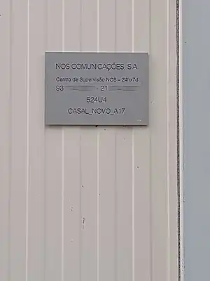 Placa identificadora no contentor de uma torre NOS Neste caso foi possível identificar o nome e referência da estação pelo que se devem adicionar as etiquetas: |