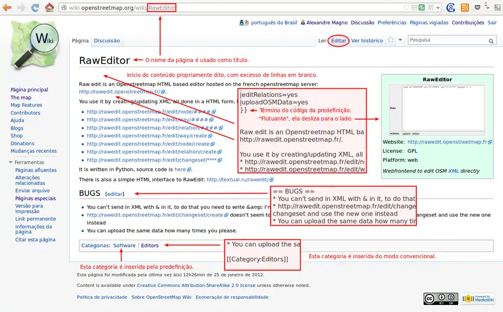 O texto preto dentro das caixas vermelhas é o código wiki que gera o resultado apontando pelas setas.