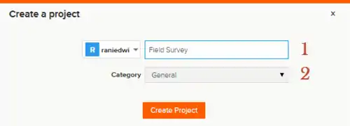 - Then appear the view like this, fill column with the name of project that you want to create as example, Field Survey. Select General in Category column and click Create Project.
