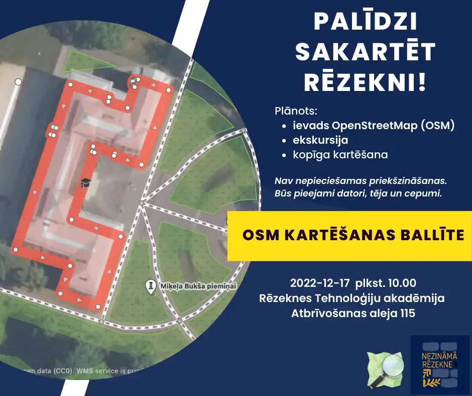 2022. gada 17. decembrī plkst 10:00 tiekamies Rēzeknes Tehnoloģiju akadēmijā (RTA) OpenStreetMap kartēšanas pasākumā.