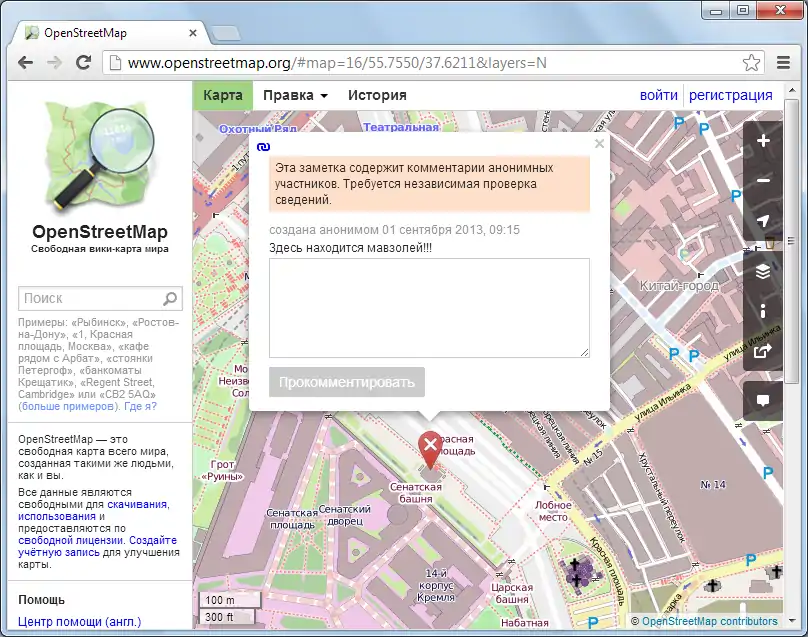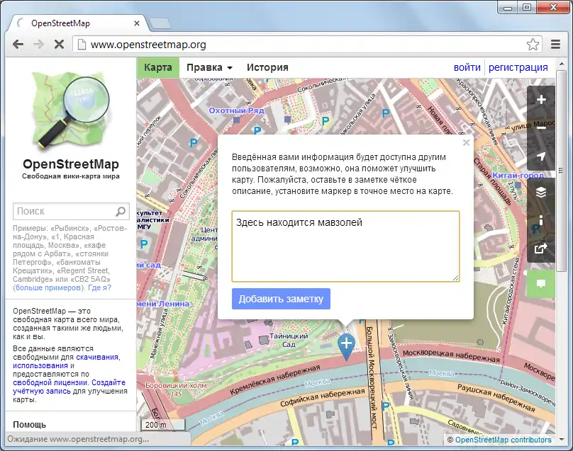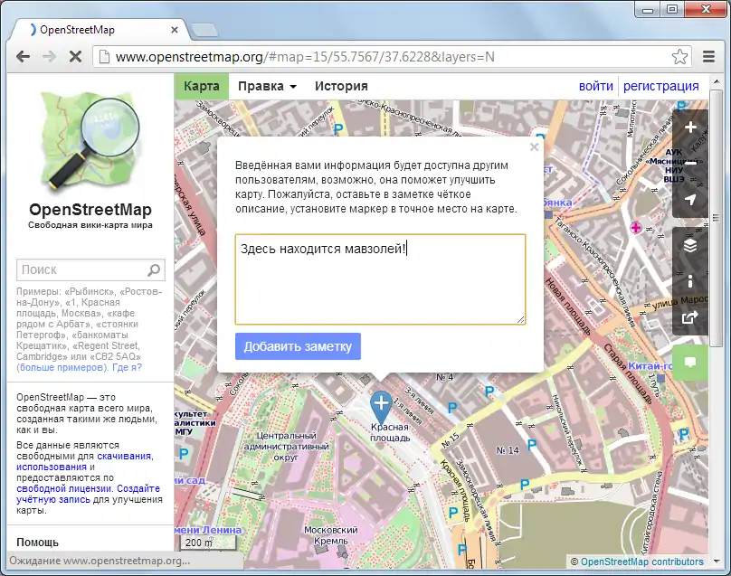 Если у вас есть учётная запись OpenStreetMap, стоит предварительно войти в неё, чтобы заметке автоматически присваивалось ваше имя пользователя. Но основная прелесть заметок в том, что иметь учётную запись совершенно не обязательно. Любые случайные посетители могут с лёгкостью добавлять заметки. Если вы захотите стать кем-то большим чем "любой случайный посетитель", кликните на ссылку "регистрация"! (См. RU:Creating an Account)
