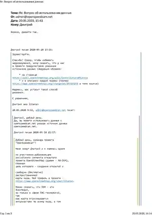 19 мая 2020 года в адрес основателя данного проекта (не раскрывшего свое имя) было направлено электронное письмо с просьбой разрешить уточнять данные в OSM по данным, размещенным на сайте OpenSpeedcam. На следующий день 20 мая 2020 года - был получен положительный ответ (см. переписку в приложенном файле).