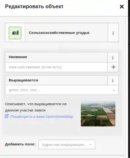 Среди полей ниже всегда есть поле "Название". В нём укажите общеупотребительное название объекта, но только если оно есть! Не пишите туда описание объекта, например "просёлочная дорога" или "многоэтажный дом". Свойства объекта должны быть выражены через теги, которые вы можете найти в вики. Если вы не уверены, какой тег указать, или тега для этих свойств просто нет, опишите объект в дополнительном поле "Заметка для картографов", о котором рассказано ниже. Для каждого поля в шаблоне можно щёлкнуть кнопку "i" — откроется справка по тегу, который данное поле заполняет.
