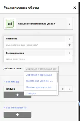 - Адресная информация — для указания номера дома, улицы и почтового индекса. Город указывать необязательно. Обычно это поле заполняется для зданий, указание адресов для организаций является предметом дискуссий и потому для новичков не рекомендуется.
