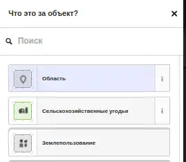 После того как вы закончили рисовать объект, на панели справа появится меню, предлагающее выбрать "заготовку" для объекта. Заготовки обычно соответствуют реальным объектам — зданиям, рекам, дорогам, лесам и т.д. В строке "Поиск" введите, что за объект вы нарисовали — появятся наиболее подходящие варианты (если вариантов не нашлось, попробуйте синонимы). Когда вы выбираете заготовку, редактор автоматически присваивает теги объекту, и вместо него появляется меню, позволяющее дальше уточнить свойства объекта.