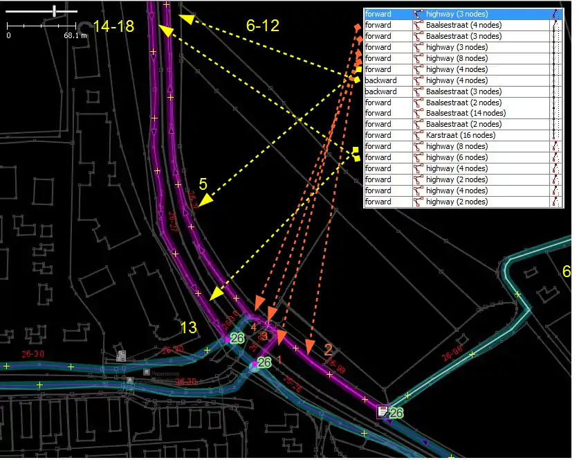 - 13-18 часть маршрута, которую необходимо пройти при переходе от 27 (больше) к 26 (меньше). Исключительно то, что такая развилка (ветка) продолжается до следующей пронумерованной велосипедной точки, как здесь. Следовательно, все линии в этом отношении будут иметь значение — forward или backward.