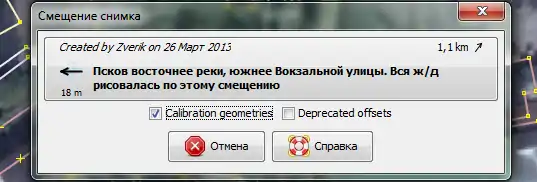 Для загрузки вычисленного смещения на сервер выберите пункт «сохранить смещение снимка». От вас потребуют только описание района, к которому применимо смещение. Внимание: это не название точки, где смещение определялось, а район. Город в примере мал и лежит на равнине, поэтому смещение везде одинаково:
