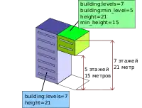 | building:levels | Целое число | Количество видимых уровней (этажей) в здании, используемое в схеме Простые 3D здания. | ![]() | |