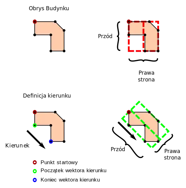 Пунктирная линия - это проекция здания на первом этаже. Как вы можете видеть, он меньше контура крыши, полученного с аэрофотоснимка. Схема здания на первом этаже должна быть правильно маркирована, например: