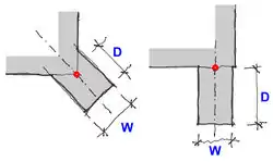 Подпорные стенки нарисованы как точки с соответствующими метками. Направление удерживающей стенки всегда является биссектрисом двух соседних векторов, длина удерживающей стенки «D» всегда вытягивается наружу. Если кто-то хочет нарисовать сложную подпорную стену, которой нет в описании ниже, она должна использовать схему меток, используемую для элемента «Стена», описанного на странице «OSM-4D»