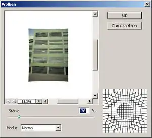 Attention: der Grad der Entzerrung mit diesem Filter (Eingabe des Wertes im Dialogfenster) hängt von dem Weitwinkel des Objektivs.