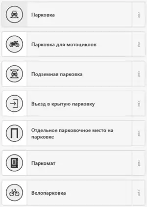 На странице «Парковка» можно найти теги, относящиеся к парковке для других типов транспортных средств и ситуаций. Смотрите страницу street parking для получения дополнительной информации о картировании парковки вдоль улиц.