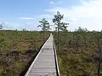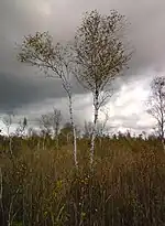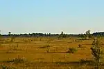 Верховое болото. Полузатопленная местность, питаемая, главным образом, осадками (или подземными водами), торфяник. Древесный ярус отсутствует или состоит из несомкнутых сосен в карликовой болотной форме или берез. Травяно-кустарничковый ярус состоит из берёзы карликовой, пушицы влагалищной, морошки, клюквы, подбела, багульника, голубики, росянок и др. Подстилка из травы и мха мягкая, при продавливании вода может проявиться на поверхность. Квалифицирующий признак - наличие торфообразования, травянистая и моховая растительность (при пересыхании или сильном дренаже, возможно образование кочек, на которых растут кусты и отдельные деревья), обычно - высокое содержание соединений железа в воде (ржавый осадок), практически всегда можно встретить мхи рода Сфагнум, часто - растения семейства Вересковые (Вересковые в Википедии) (Багульник болотный, ягодные кустарнички рода Вакцинум, такие как брусника, клюква).