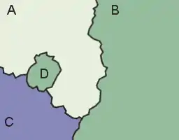D is an exclave of B, but not an enclave of A since it also shares a border with C.