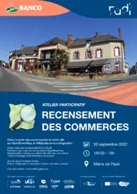La communauté locale se réunit régulièrement, soit pour proposer des ateliers grand public de découverte d'OpenStreetMap, soit pour échanger entre contributeurs. Retrouvez nos prochaines dates ci-dessous, et nos actions passées dans les comptes-rendus. Ateliers "Recensement des commerces"![]() Affiche de l'évènement Dans le cadre du projet RUDI de Rennes Métropole, plusieurs ateliers citoyens de recensement des commerces sont organisés par l’équipe de BANCO (Base nationale des commerces ouverte). Nous vous invitons à nous rejoindre pour une déambulation urbaine et pour améliorer la carte des commerces sur OpenStreetMap. Plusieurs dates d'ateliers sont proposées dans différentes communes de Rennes Métropole :