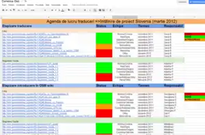 - În prima imagine este agenda de lucru pentru atelierul de traduceri ce avea ca sarcină de lucru, Întrebări frecventeși Ghidul începătorului , așa cum arăta în decembrie 2011.Se poate observa că unele traduceri sunt terminate și deja introduse, altele în progres, iar altele de făcut în continuare.