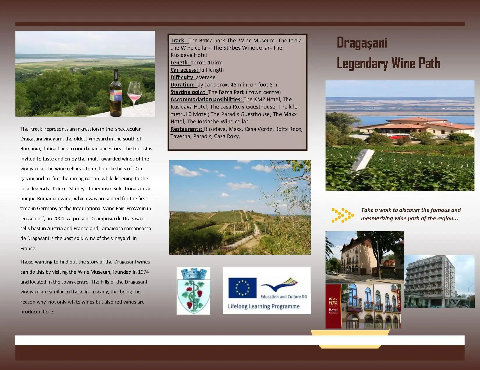 - Descriere traseu:Traseul turistic ales se doreşte o incursiune în pitorescul Podgoriei Drăgăşani, cea mai veche podgorie din sudul României, datând de pe vremea geto-dacilor. Turistul este invitat pe acest traseu să savureze vinurile podgoriei, medaliate naţional şi internaţional direct din cramele situate pe dealurile de la marginea oraşului Drăgăşani şi să-şi aprindă imaginaţia după ce ascultă legendele locului. Prince Ştirbey, este vinul românesc unic în lume de „crâmpoşie selecţionată”, prezentat în premieră în Germania la Târgul internaţional de vinuri ProWein, care a avut loc la Düsseldorf între 29 februarie şi 2 martie 2004. În prezent, Crâmpoşia de Drăgăşani se vinde bine în Austria şi în Franţa iar Tămâioasa românească de Drăgăşani este cel mai bine vîndut vin al podgoriei în Franţa.