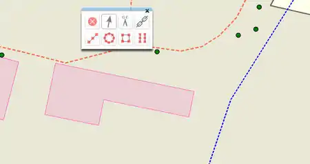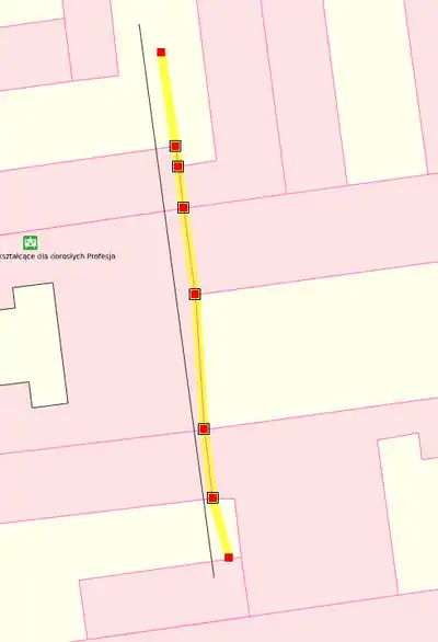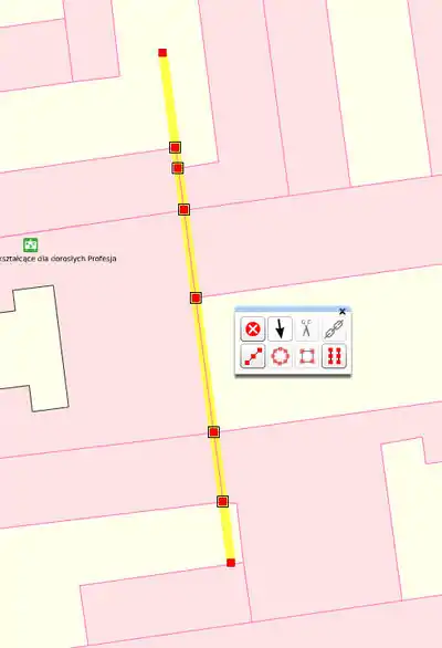 Situation: Some adjacent buildings (as an example here downtown, old buildings). We see the outer walls of the buildings are in fact a straight line, but in the drawing shape it is "almost" straight. To straighten these edges, we draw an auxiliary line, touching all points of this curve. It is necessary that at least one endpoint is outside this line to straighten the walls:
