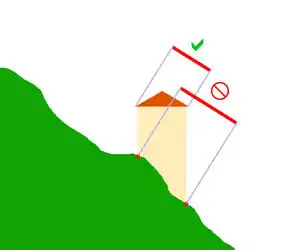 In such cases only the roof shape should be drawn as the building outline and not the geometry of the intersection lines between the building outline and terrain: