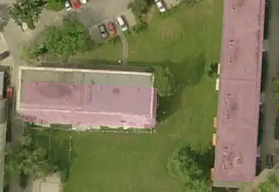 On the buildings on aerial photographs from low altitude (usually higher resolution) perspective distortion is often seen. This means that the correctly-drawn outline of the roof is larger than the building outline.