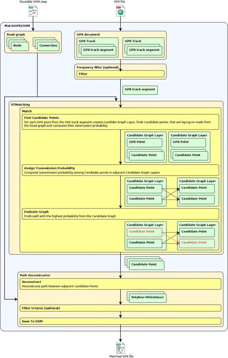 MatchGPX2OSM utility matches GPX track logs to the map. It is using STMatching algorithm.