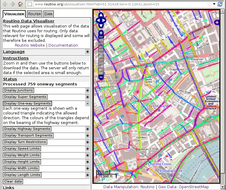 The web interface that allows routes to be calculated also provides a way of visualising the data that is used for calculating the route. A second web page is available (linked to the router page by the "Data" tab) that can be used to display various information about the contents of the Routino routing database.