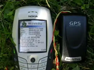 ![]() RoyalTek RTB 1000 connected to a Nokia 6600 running nmea_info.py |