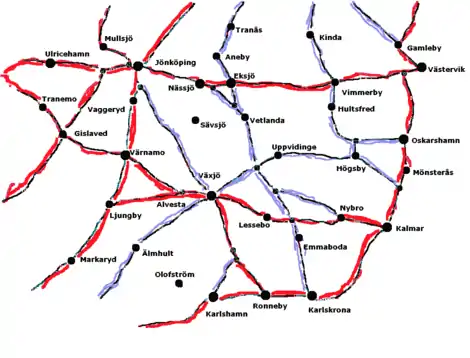 Outline of the major roads and cities of Småland and Blekinge in Sweden, see current map