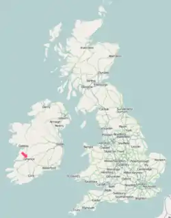 The closest international airport is Shannon (SNN), then Galway (GWY), Cork (ORK), Waterford (WAT), Dublin (DUB), and Belfast (BFS).
