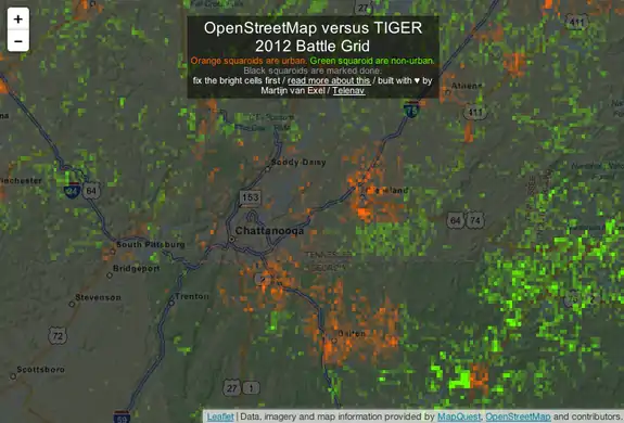 The TIGER Battlegrid () uses TIGER 2012 data to make a broad brushstroke comparison to indicate large areas (grid squares) where OpenStreetMap data seems to be most heavily out of whack. Usually this reveals areas where the OSM data is out of alignment with reality because it's an area of particularly poorly aligned data from the older TIGER dataset, where nobody has done any TIGER fixup work. Use the Battlegrid tool to locate these areas and fix things up! However when you come to work on fixup at the detailed level you may also like to use...
