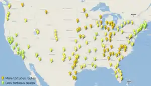 It took six weeks for everyone to get stuck in a make all 250 cities rout-able. In a second phase, this analysis was refined to show "tortuous" routes. Routes which look suspiciously long.